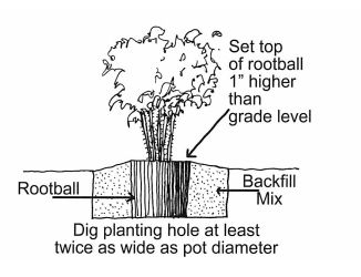 Dig a hole at least twice as wide and only as deep as the rootball of the plant. Adjust the hole so that the top of the rootball is about 1″ above ground level. Remove the plant from the container by turning the plant upside down and gently sing it out and set it in the hole. Refill the hole with a blended mixture of 1/3 Soil Pep or 2/3 of your garden soil. The use of Fertilome Root Stimulator at planting time will greatly reduce transplant shock and help the plant resume normal growth more quickly. Raspberries are planted one to three feet apart, Blackberries four to six feet apart. Never plant Black Raspberries within 700 feet of Red Raspberries. Black Raspberries are susceptible to virus diseases carried by the reds.