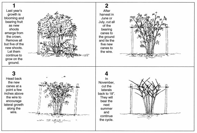 For Single Crop Raspberries and Blackberries, the cane will usually die after bearing fruit the second year. It should be removed at ground level after harvest, leaving the one-year-old canes to produce fruit the following year. These new canes can be tied to a single wire set about 3 ½ feet high, contained between two wires set about 3 ½ feet high, or attached to a fence. Two Crop Raspberries can be pruned the same way, resulting in two crops each year. After the first crop is harvested in September, cut back the portion of the cane that fruited, the lower portion of the cane will fruit the following summer. However, many people simplify pruning by mowing down the entire plant late in the fall after that year’s crop is harvested. This results in one crop each year in September, and the plant will often support itself without trellising.