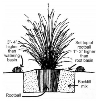 Dig a hole twice as wide and only as deep as the root ball of the grass. Be sure to adjust the hole so that the top of the root ball is 1″ to 2″ above ground level. Next, remove the container. Plastic pots can be removed by turning the plant upside down or laying it on its side and gently tapping at the pot until the grass slides out. Refill the hole with a blended mixture of 1/3 Soil Pep and 2/3 of your garden soil. Firm the backfill by tamping it gently. Build a watering basin around the plant high enough to hold 3″ to 4″ of water. Make the basin at least as wide as the hole that was dug. Immediately water the plant deeply by filling the basin with water once, letting it soak in, and filling it up a second time. The use of root stimulator at planting time will greatly reduce transplant shock and encourage your grasses to resume their normal growing habits more quickly.