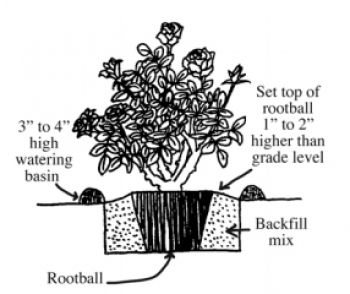 Dig a hole twice as wide and only as deep as the rootball of the plant. Adjust the hole so that the top of the rootball is 1″ to 2″ above ground level. Next, remove the container. Plastic pots can be removed by turning the rose upside down and gently easing the plant out. Refill the hole with a blended mixture of 1/3 Soil Pep and 2/3 of your garden soil. The use of Fertilome Root Stimulator at planting time will greatly reduce transplant shock and help the plant resume normal growth more quickly.