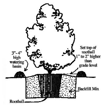 For plants that will be watered with lawn sprinklers, water as described above at planting time. Then remove the basin. Most of the plant’s day to day water needs will be met by the lawn watering. However, a deep soaking every month or two is recommended in addition to the lawn watering. In addition, during the winter a monthly deep soaking of all newly planted shrubs is a good idea. This should be done for the first two winters after planting.