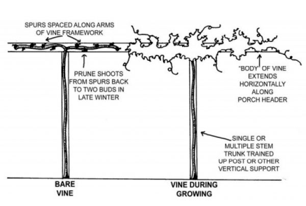 Plants such as Wisteria, Trumpet Vine and Grapescan be pruned into a permanent, woody framework. To do this, form a multi or single trunk up to the height desired and horizontal branches or “arms” to cover the area. The vine can be maintained to the basic size of your framework by pruning back to two bud “spurs” early each spring.